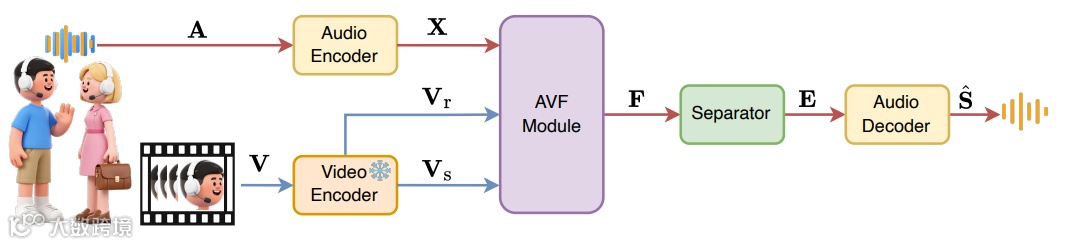 • 視覺編碼器“路徑依賴”問題:主流方法依賴預(yù)訓(xùn)練大型視頻編碼器提取語義特征,導(dǎo)致視覺分支計(jì)算開銷超過音頻處理;輕量方案則易丟失深層語義,影響分離效果。