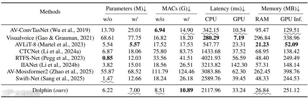 Dolphin是首個(gè)在包含視覺編碼器情況下參數(shù)量壓縮至6M級(jí)別仍保持高質(zhì)量分離的AVSS模型,GPU推理速度相較現(xiàn)有SOTA模型提升6倍以上,為端側(cè)實(shí)時(shí)語音處理提供了全新解決方案。