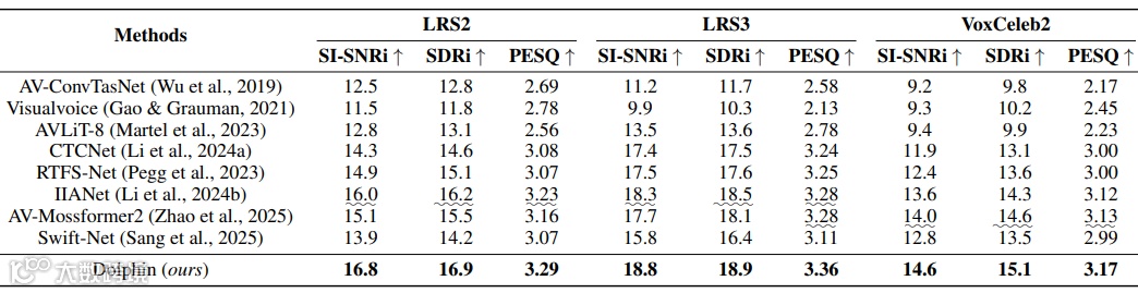 在LRS2、LRS3和VoxCeleb2三大權(quán)威視聽分離數(shù)據(jù)集上,Dolphin全面領(lǐng)先: