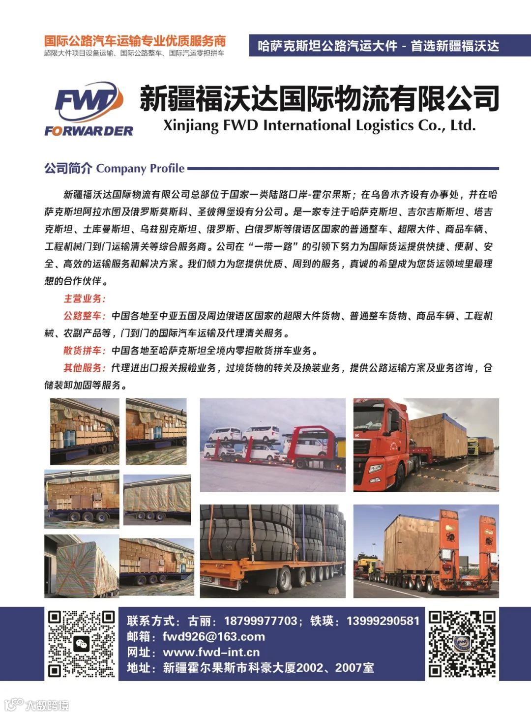 新疆福沃達(dá)國際物流有限公司總部位于國家一類陸路口岸——霍爾果斯,在烏魯木齊設(shè)有辦事處,并在哈薩克斯坦阿拉木圖及俄羅斯莫斯科、圣彼得堡設(shè)立分公司。公司專注于為哈薩克斯坦、吉爾吉斯斯坦、塔吉克斯坦、土庫曼斯坦、烏茲別克斯坦、俄羅斯、白俄羅斯等俄語區(qū)國家提供普通整車、超限大件、商品車輛、工程機(jī)械等門到門運(yùn)輸及清關(guān)一體化服務(wù)。