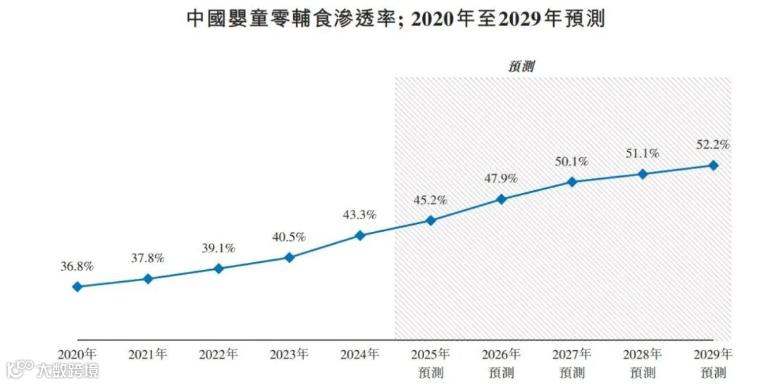 數(shù)據(jù)顯示,6個月至6周歲兒童的零輔食滲透率從2020年的36.8%升至2024年的43.3%,預計2029年將達到52.2%。市場規(guī)模由362億元增至459億元,有望在2029年突破600億元。