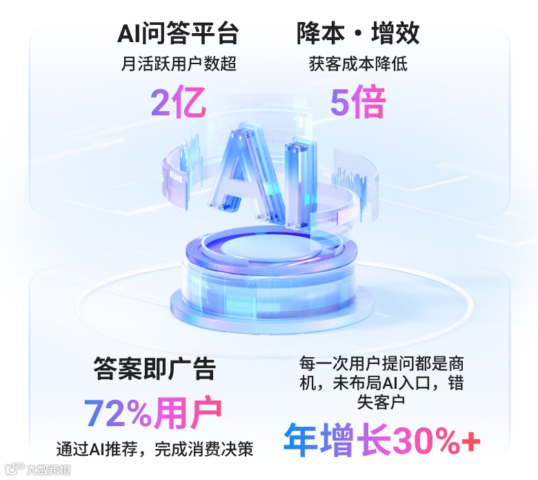 「廣告價(jià)值凸顯」:72%的用戶通過AI推薦完成消費(fèi)決策,每一次用戶提問都是商機(jī),未布局AI入口,就可能錯(cuò)失客戶,且相關(guān)業(yè)務(wù)年增長(zhǎng)超30%。