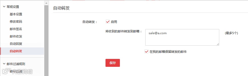可將郵件自動轉(zhuǎn)發(fā)至其他郵箱用于備份,建議勾選“在我的郵箱保留轉(zhuǎn)發(fā)的郵件”,避免原郵件丟失。