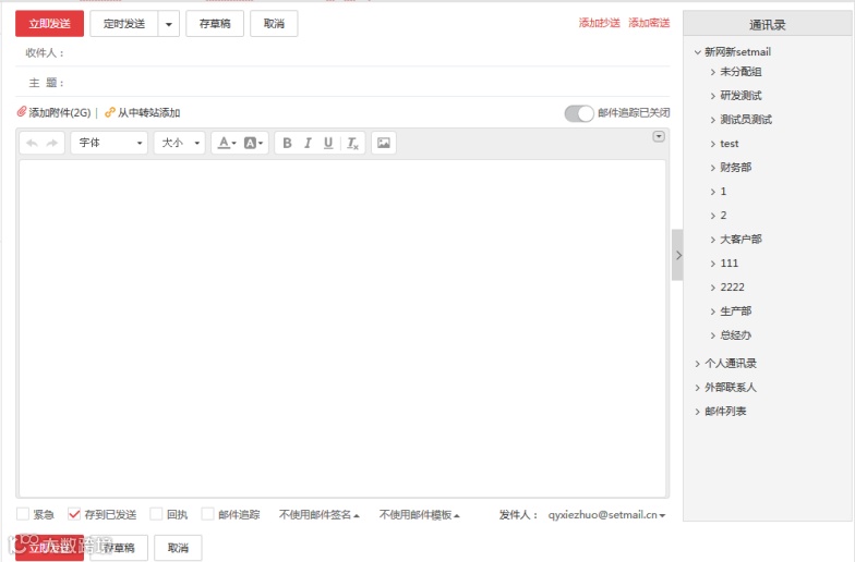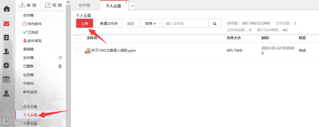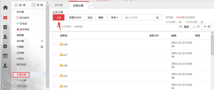 用于上傳企業(yè)內(nèi)部文件,不占用郵箱容量。需管理員授權(quán):作者角色可上傳、刪除、重命名文件;讀者權(quán)限僅支持下載。