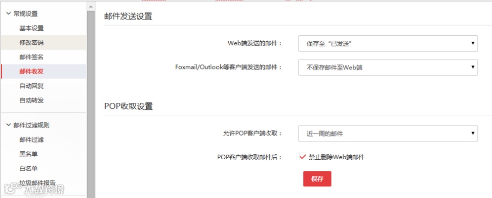 可設(shè)置Web端發(fā)送郵件是否保存至“已發(fā)送”。若使用Outlook等POP客戶端,可設(shè)置是否同步至Web端。