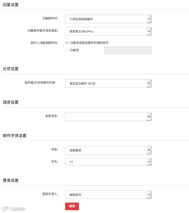 可設(shè)置回復(fù)是否包含原文、語言類型、默認(rèn)賬號、每頁郵件數(shù)、系統(tǒng)語言、字體及登錄后默認(rèn)頁面。