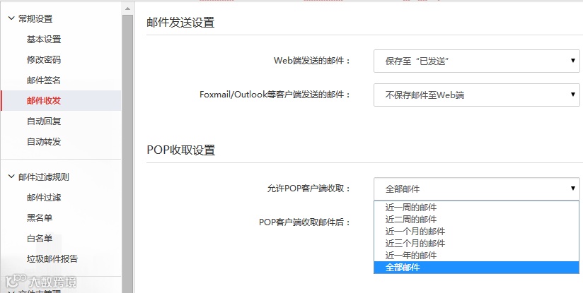 支持調(diào)整POP收取范圍(如全部郵件),并可啟用“POP收取后禁止刪除Web端郵件”,防止數(shù)據(jù)丟失。