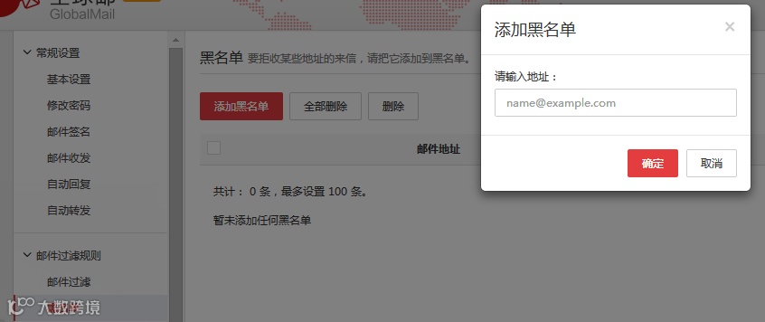 可將特定發(fā)件人或域名加入黑名單,拒收其郵件,最多支持500條。