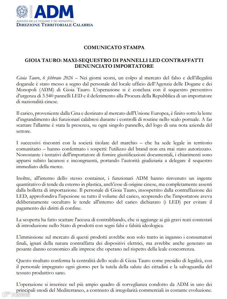 截至目前,被查扣的涉嫌假冒LED面板及瞞報(bào)商品均已被扣押,后續(xù)將由意大利海關(guān)按照相關(guān)程序進(jìn)行進(jìn)一步鑒定和處理。ADM表示,將持續(xù)加強(qiáng)對(duì)進(jìn)口集裝箱貨物的監(jiān)管力度,防止非法商品進(jìn)入歐盟市場(chǎng),維護(hù)合法貿(mào)易秩序和知識(shí)產(chǎn)權(quán)保護(hù)。