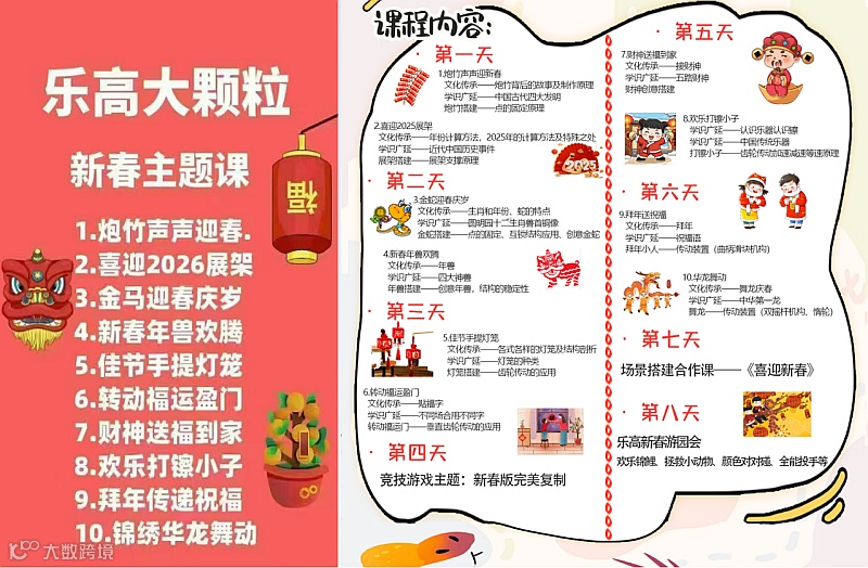 傳統(tǒng)文化與科技原理巧妙融合。孩子們不僅通過搭建炮竹、年獸、舞龍等節(jié)日主題作品,深入體驗(yàn)春節(jié)文化,更能在動(dòng)手過程中學(xué)習(xí)齒輪傳動(dòng)、結(jié)構(gòu)穩(wěn)定、機(jī)械原理等知識(shí)。課程設(shè)計(jì)注重創(chuàng)意表達(dá)、邏輯思維與團(tuán)隊(duì)協(xié)作,并設(shè)有主題競(jìng)技互動(dòng)與合作場(chǎng)景,讓孩子在歡樂的新春氛圍中,鍛煉動(dòng)手能力、解決問題能力,收獲知識(shí)、創(chuàng)意與自信。