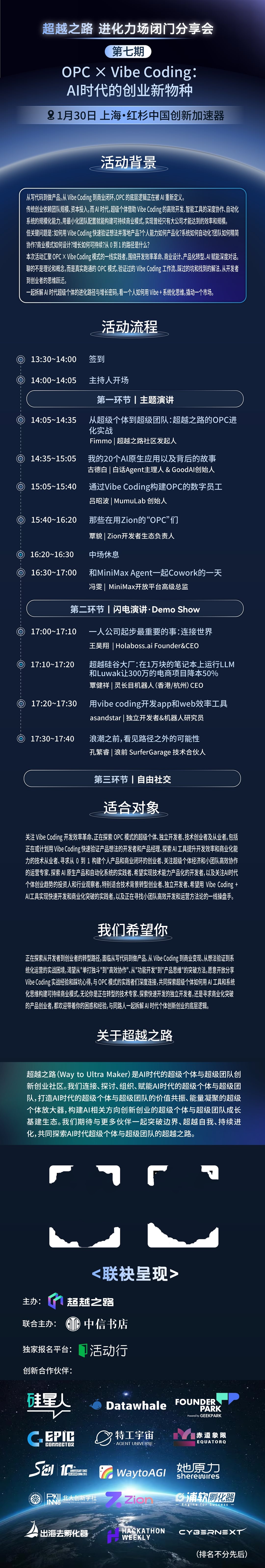 超越之路社區(qū)將于1月30日(本周五)下午在上海·紅杉中國(guó)創(chuàng)新加速器舉辦「進(jìn)化力場(chǎng)」第七期線下閉門分享會(huì),本期活動(dòng)由中信書店聯(lián)合主辦。本期活動(dòng)圍繞"OPC × Vibe Coding | AI時(shí)代的創(chuàng)業(yè)新物種"這一主題,邀請(qǐng)八位AI OPC與Vibe Coding一線實(shí)踐者,分享真實(shí)跑通的商業(yè)模式與驗(yàn)證過(guò)的AI工作流。從年?duì)I收百萬(wàn)的 AI 原生應(yīng)用開(kāi)發(fā),到通過(guò) Vibe Coding 構(gòu)建數(shù)字員工系統(tǒng),從一人公司的全球化連接策略,到在萬(wàn)元筆記本上運(yùn)行 LLM 實(shí)現(xiàn)降本50%,全方位拆解超級(jí)個(gè)體進(jìn)化密碼。不講理論概念,只給實(shí)戰(zhàn)路徑:用真實(shí)案例拆解從想法驗(yàn)證到產(chǎn)品落地、從個(gè)人能力到產(chǎn)品化資產(chǎn)、從手動(dòng)操作到自動(dòng)化系統(tǒng)、從單兵作戰(zhàn)到精簡(jiǎn)協(xié)作、從商業(yè)設(shè)計(jì)到可持續(xù)增長(zhǎng)的完整鏈路,講清每個(gè)環(huán)節(jié)的關(guān)鍵動(dòng)作、常見(jiàn)的坑和對(duì)應(yīng)的解法,幫你找到從 0 到 1 的可執(zhí)行方法。