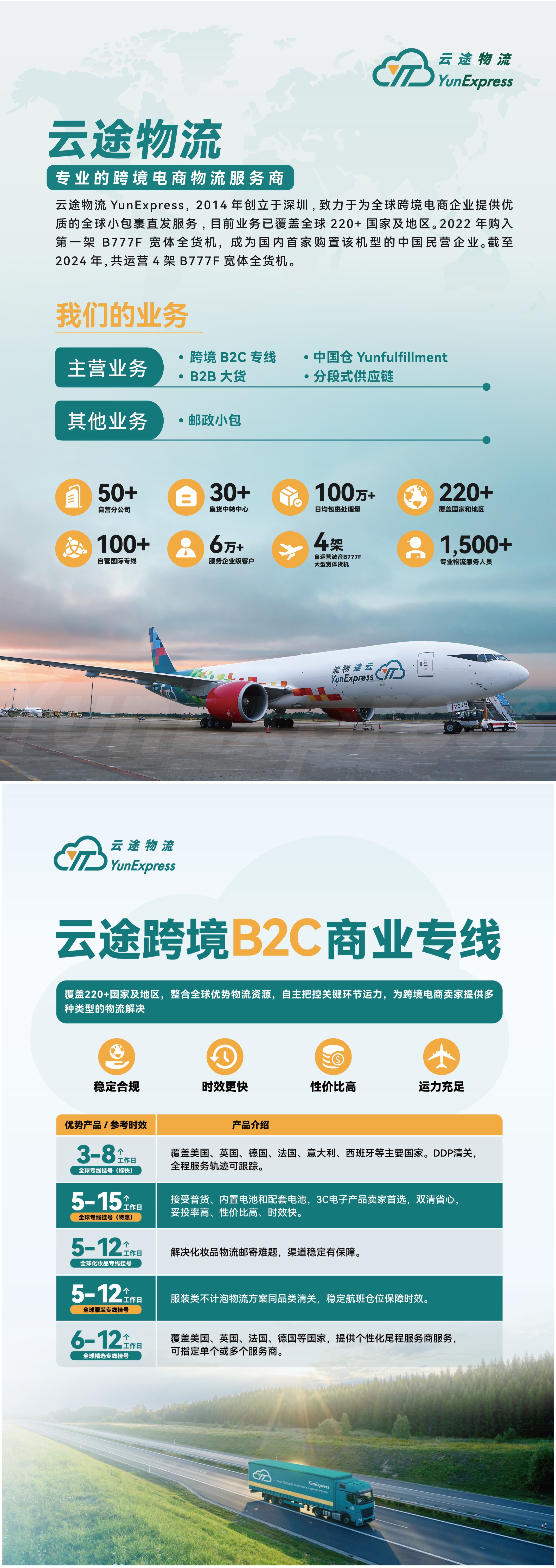 簡介:云途物流 YunExpress,中國領(lǐng)先的跨境電商服務商,縱騰集團旗下子公司,2014年創(chuàng)立于深圳,致力為全球跨境電商企業(yè)提供優(yōu)質(zhì)的全球物流服務,已覆蓋全球220+國家及地區(qū),在全球范圍內(nèi)建立了60+自營分公司,2000余名專業(yè)物流服務人員遍布世界各地,核心業(yè)務覆蓋跨境B2C專線,B2B大貨,中國倉Yunfulfillment,分段式供應鏈等,并自運營4架B777F全貨機。