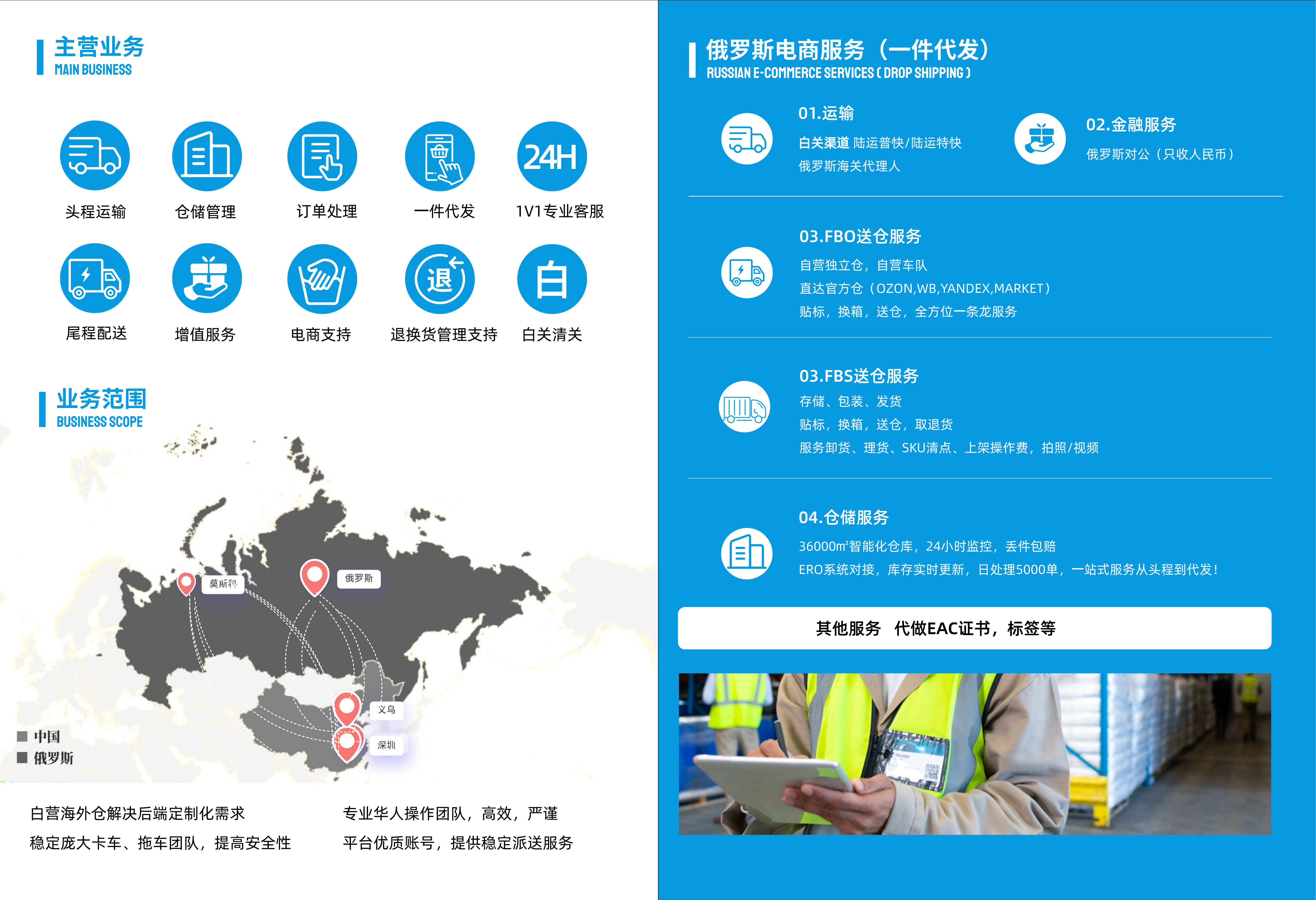 03.FBO送倉(cāng)服務(wù):自營(yíng)獨(dú)立倉(cāng),自營(yíng)車隊(duì);直達(dá)官方倉(cāng)(OZON,WB,YANDEX,MARKET;貼標(biāo),換箱,送倉(cāng),全方位一條龍服務(wù)