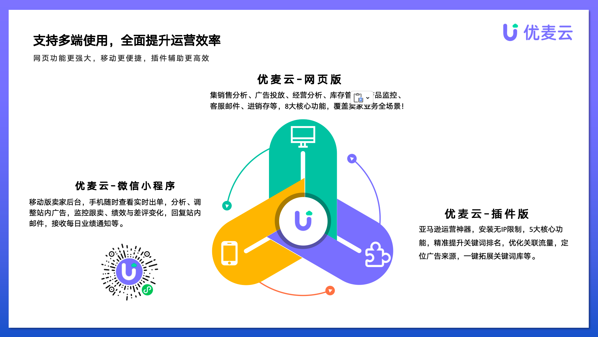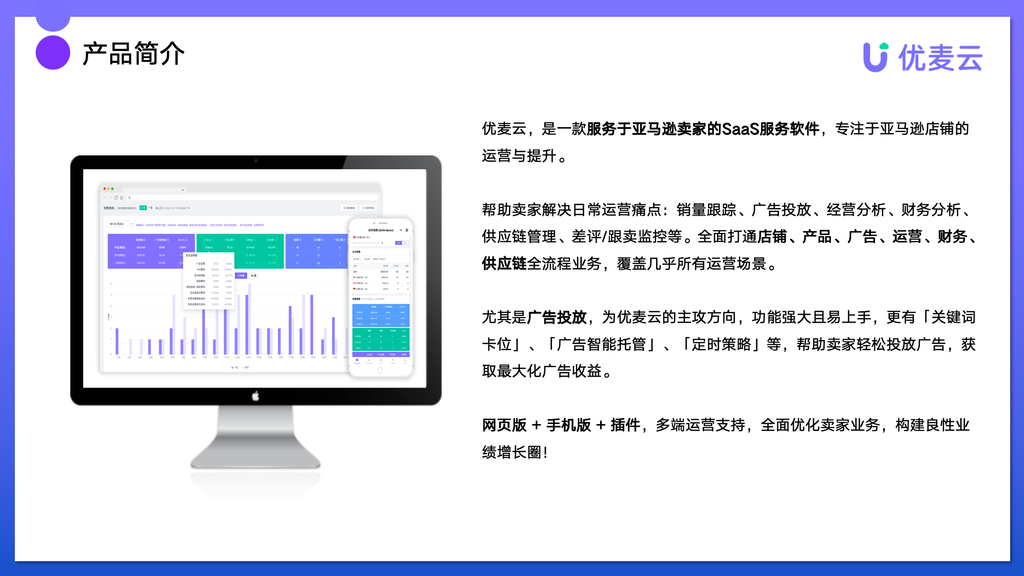 優(yōu)麥云是云雅科技繼賣家精靈后,推出的一款高效管理店鋪與廣告的軟件工具,可以幫您一站式運營多個亞馬遜店鋪,高效投放廣告!